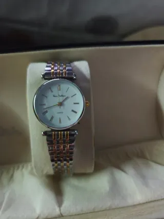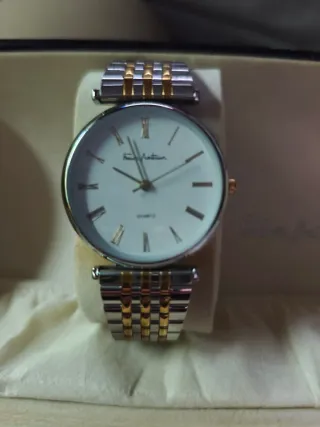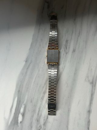 Elegante reloj de pulsera con un diseño bicolor que combina tonos dorados y plateados. Perfecto para complementar cualquier atuendo. - Esfera blanca con detalles en dorado. - Correa de eslabones en dos tonos. - Estuche y caja de regalo. - En perfectas condiciones, con plástico protector de esfera