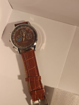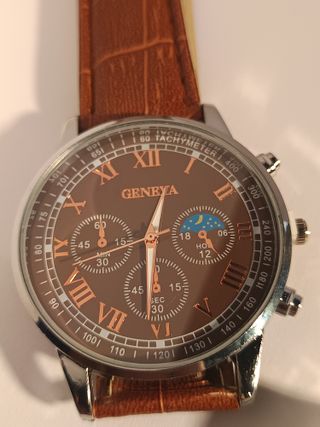 Reloj de pulsera con correa de cuero marrón y detalles plateados. - Esfera marrón con números romanos. - Correa de cuero con textura. - Bisel con escala taquimétrica.
