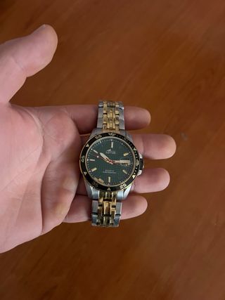 Elegante reloj de pulsera de la marca Lotus con un diseño bicolor. - Esfera de color verde. - Combinación de tonos dorados y plateados en la correa y la caja. - Resistente al agua hasta 5 BAR.