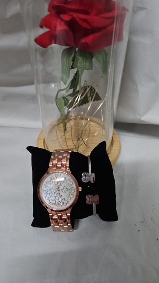 Elegante conjunto de accesorios. - Reloj con pulsera de pedrería. - Pulsera a juego. - Pendientes colgantes. - Anillo con diseño de hojas.