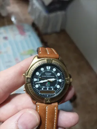 Reloj de pulsera Pulsar con correa de cuero marrón y detalles dorados en la caja. Un accesorio clásico y funcional. - Esfera negra con marcadores horarios blancos. - Correa de cuero marrón con costuras. - Caja de metal con acabado dorado. -muy buen estado -Funciona pero necesita pila(en el reverso de la tapa está apuntado el modelo)para evitar que se sulfate -LA ALARMA NO FUNCIONA -DISPONIBLE MIENTRAS ESTÉ EL ANUNCIO