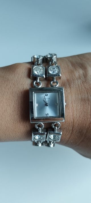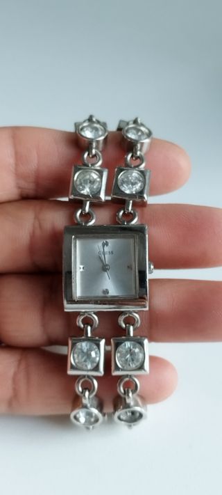 Reloj pulsera marca Guess en excelentes condiciones, pila recién cambiada, funciona perfectamente La caja mide 2 cm de cada lado Se puede ajustar quitando unos eslabones sin necesidad de ir al relojero. Una de las piedras se oscureció un poco y quedó color gris, se muestra en la última foto Tengo más cosas anunciadas en mi perfil, si compras más te puedo dar mejor precio