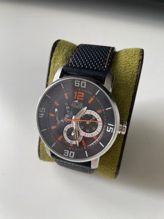 Reloj de acero Lotus, con movimiento de cuarzo analógico, multifunción, calendario. Caja de acero redonda. Esfera negra con números naranjas. Pulsera de silicona negra con pespuntes naranja. W.R. 50m