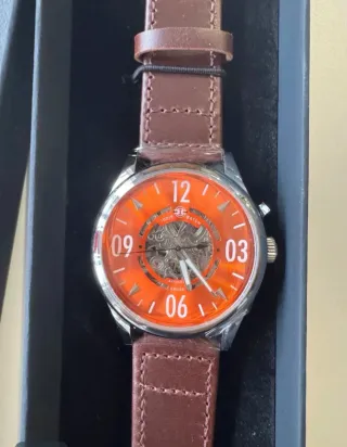 Reloj de pulsera para hombre o mujer bonito diseño ,Modelo Arosa 41rd, correa de cuero, perfecto regalo para San Valentín - Esfera de color naranja . - Correa de cuero marrón. - Mecanismo visible en la esfera. - No necesita batería, funciona con sensor de movimiento -Sumergible