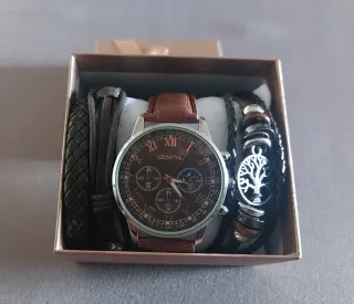 Conjunto de reloj y tres pulseras, ideal para regalar o darte un capricho. El reloj tiene una correa de cuero marrón y esfera con números romanos. Las pulseras son de cuero trenzado y adornos metálicos, una de ellas con un diseño de árbol de la vida. - Reloj Geneva sin usar y con pila - Tres pulseras de estilo moderno. - Correa de cuero marrón. - Esfera con números romanos.