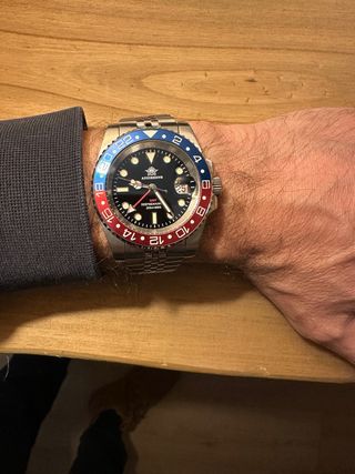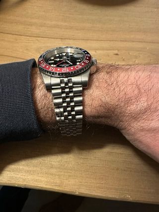 Reloj de pulsera con bisel estilo Pepsi, 40mm - Bisel giratorio bidireccional con marcas rojas y azules. - Esfera negra con marcadores de hora luminosos. - Ventana de fecha a las 3 en punto. - Correa jubilee de acero inoxidable. - Cristal vidrio mineral