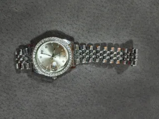 Elegante reloj de pulsera con un diseño sofisticado. - Bisel adornado con cristales. - Esfera plateada con detalles. - Correa de eslabones metálicos.