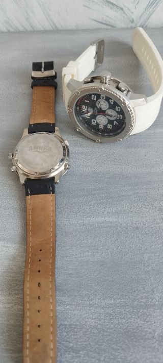 Dos relojes Auriol de cuarzo, uno con correa negra y otro con correa naranja. - Diseño unisex. - Esfera con detalles en naranja y negro. - Mecanismo de cuarzo de precisión con cronómetro e indicación 24 horas. - Sumergible hasta 10 bares. - Con indicación de la fecha, agujas luminosas y luneta giratoria. - Caja ligera con pulsera de silicona blanda ajustable. - Sin usar. - Esfera de 4'5 cm. y 1'3 de grueso - Unidad 8€. Los dos 15€