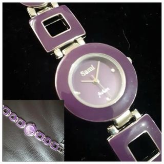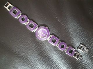 Elegante reloj de pulsera con un diseño moderno. Ideal para Regalo. - Esfera redonda con detalles. - Pulsera con eslabones cuadrados y circulares. - Combinación de colores morado y plateado. ReziclAndo Calvario Vigo