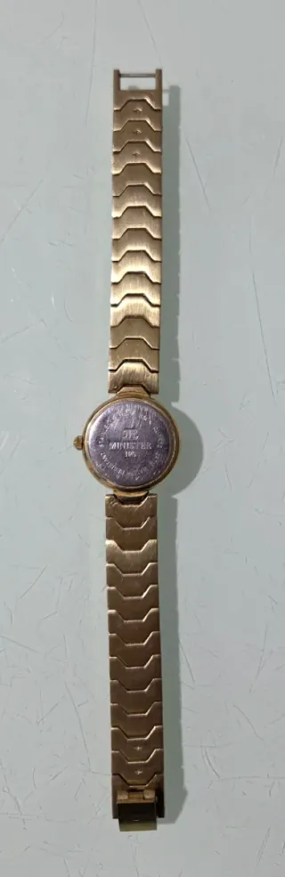 Elegante reloj de pulsera con correa de cuero. - Esfera redonda. - Detalles en tono dorado. - Correa de cuero marrón. Es necesario cambiar la batería y volver a colocar las dos rayas del dial en su sitio. En general, el estado es bueno