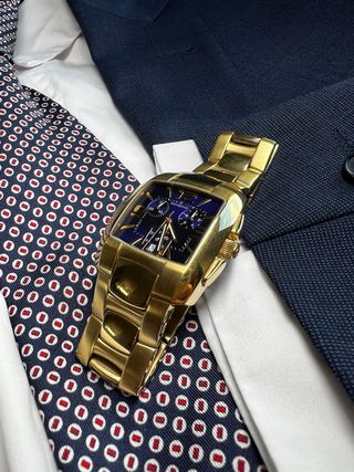 Reloj para hombre HANPOSH, cronógrafo de acero inoxidable, resistente al agua, fecha, analógico, cuarzo, informal, de negocios y de moda. Elegante reloj deportivo con detalles en dorado y esfera azul. - Bisel giratorio azul. - Correa de acero inoxidable con eslabones dorados y plateados. - Resistente al agua 30M. Reloj en buen estado. No funciona. La corona está rota. Para piezas o reparación.