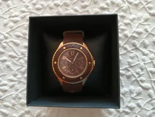 Reloj de pulsera con un diseño moderno y elegante. - Bisel con detalles en dorado. - Correa de material sintético en tono marrón. - Esfera con múltiples indicadores.
