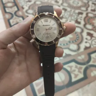 Elegante reloj con un diseño deportivo y un acabado bañado en oro. - Esfera negra con detalles dorados. - Correa de goma negra.