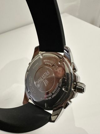 Elegante reloj Jaguar con caja y correa en tonos negros y detalles plateados. Presentado en su caja original. - Diseño deportivo y sofisticado. - Bisel con detalles grabados. - Esfera con múltiples subesferas.
