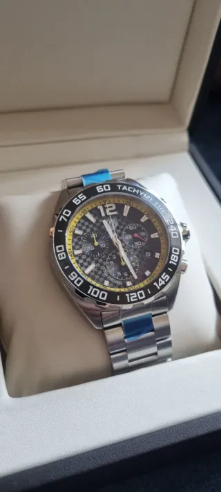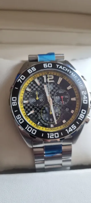 Reloj TAG Heuer Formula 1 con diseño deportivo y elegante. - Bisel con taquímetro. - Esfera con detalles a cuadros y subesferas. - Brazalete de acero inoxidable.