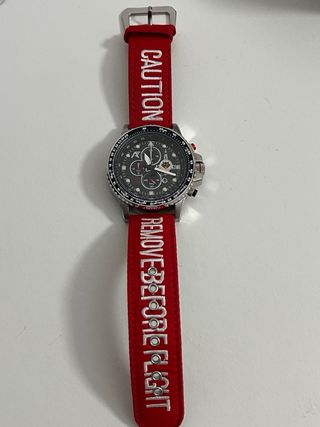 Reloj de aviador con correa roja y detalles plateados. Está en excelentes condiciones. - Cronógrafo multifunción. - Diseño elegante y deportivo. - Correa de tela resistente. - Caja de acero quirurjica de 48mm, esfera en fibra de carbono. Water resistant 20 ATM - Ala 12