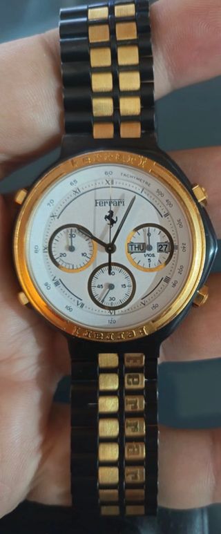 Reloj cronógrafo Ferrari Fórmula by Cartier. Un accesorio deportivo y elegante. - Esfera blanca con detalles dorados. - Correa de eslabones en negro y dorado. - Bisel con taquímetro.