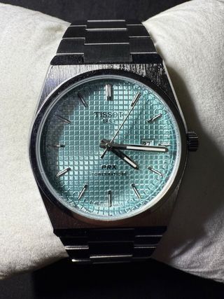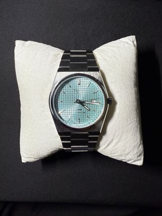 Reloj Tissot PRX con esfera de un llamativo color azul claro y acabado texturizado. - Diseño deportivo y elegante. - Ventana de fecha. - Fabricado en Suiza