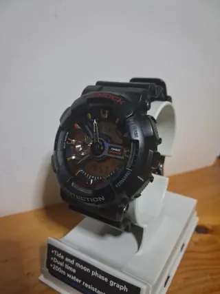 Reloj Casio G-Shock con resistencia al agua de 200 metros. Presenta un diseño robusto y deportivo. - Función de gráfico de mareas y fases lunares. - Doble hora. - Resistencia a golpes.