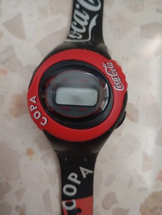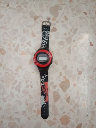 Reloj de pulsera con diseño de Coca-Cola y temática de Copa. - Correa negra con logo de Coca-Cola. - Esfera roja con detalles. - Diseño deportivo.