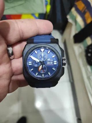 Reloj Lotus con diseño deportivo y moderno. La correa es de color azul y la caja es negra. - Cronógrafo. - Resistente al agua 10 BAR. - Indicador de día de la semana.