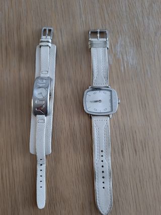 Dos relojes de la marca DKNY y Custo con correa ambos en color blanco. Uno de ellos tiene una correa ancha y el otro una correa más fina. - Correa de cuero. - Cierre de hebilla. Nuevo el DKNY costó 136€ y el Custo 176€ Se venden juntos o por separado. 25€ reloj o 40€ los dos