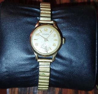 Reloj de pulsera de los años 60. Con movimiento de cuerda manual. Chapado en oro. Mecanismo de fabricación suiza con 17 rubíes. Su diámetro es 31mm. En buen estado y funcionando correctamente. Para recoger junto al metro O'Donnell o se envía por correo.