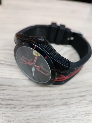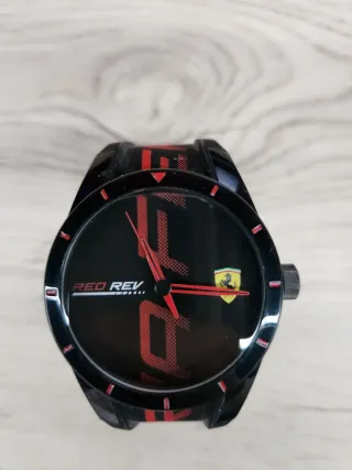 Reloj deportivo con un diseño llamativo. - Correa de goma negra con detalles rojos. - Esfera negra con números y manecillas rojas. - Logo de Ferrari en la esfera.