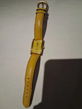 Elegante reloj con correa de cuero amarilla y detalles dorados. - Esfera rectangular de color amarillo. - Logo del cavallino rampante de Ferrari. - Indicadores horarios y agujas en tono dorado.