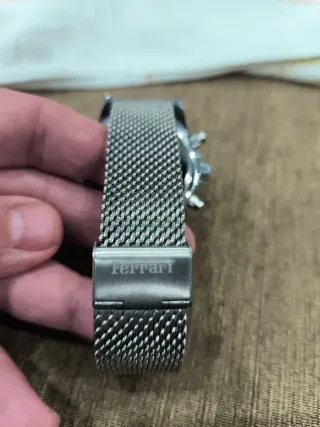 Elegante reloj con esfera roja y detalles plateados. - Diseño moderno y deportivo. - Correa de malla metálica ajustable. - Logo de Ferrari en la esfera y funciona.
