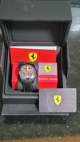 Reloj de la marca Ferrari en color negro y rojo. Se vende con su caja original. Puesto solamente una vez, IMPORTANTE: los minutos van bien pero la aguja de las horas se va atrasando, a lo mejor hay forma de configurarlo pero no lo sé. - Diseño deportivo. - Correa de caucho. - Esfera con detalles en rojo.