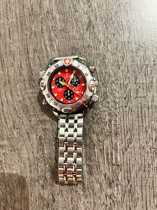 Elegante reloj Festina con detalles en rojo y plateado. - Diseño deportivo y moderno. - Bisel con detalles en rojo. - Correa de metal plateado.