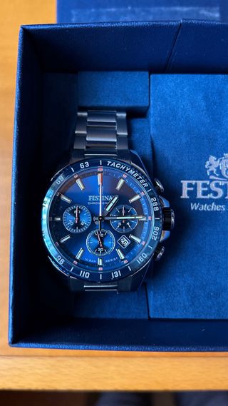 Reloj Festina original de color azul oscuro, elegante y deportivo a la vez. Cuenta con esfera azul marino con cronógrafo, caja y brazalete de acero a juego, y acabados de alta calidad característicos de la marca. Se entrega con estuche original Festina y certificado internacional de garantía, ideal tanto para uso diario como para ocasiones especiales. Excelente opción para quien busca estilo, precisión y fiabilidad en un solo reloj.