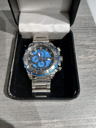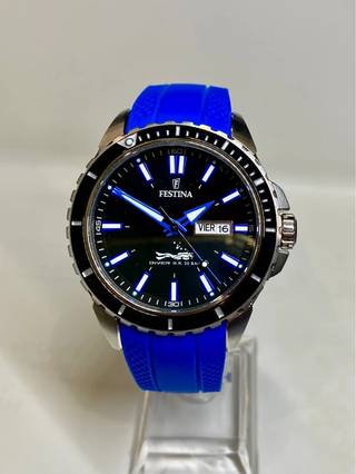 Elegante reloj Festina con un diseño deportivo y moderno. Combina a la perfección el color negro con detalles en azul, se uso en un par de ocasiones, esta nuevo sin arañazos