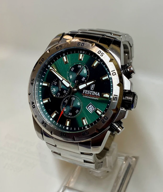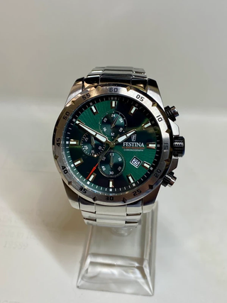 Reloj de pulsera Festina con un diseño deportivo y elegante. - Bisel giratorio de color verde. - Correa de eslabones plateada. - Esfera negra con detalles plateados. Se entrega con caja y papales *Precio negociable
