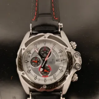 Elegante reloj Festina para hombre con detalles deportivos. - Esfera plateada con cronógrafo. - Correa negra con costuras rojas. - Bisel con detalles en fibra de carbono.