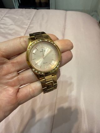Elegante reloj Festina para mujer con un diseño sofisticado en dorado y detalles con el fondo rosa. Funciona perfectamente, tiene algún desgaste pequeño del roce pero está bien cuidado.