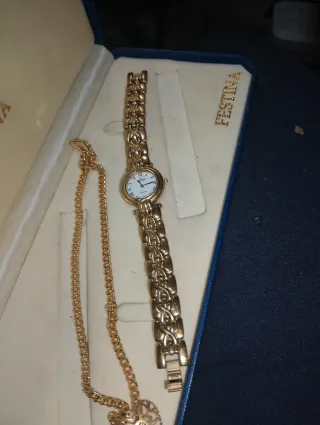 Conjunto de joyería Festina vintage presentado en su estuche original. - Reloj de pulsera dorado con diseño clásico. - Collar con colgante en forma de corazón. - Estuche de cuero azul. Forma parte de una serie limitada de la época de los setenta creo no equivocarme es el 22-70-22-80 no recuerdo de la serie numerada no sabía nada del valor hasta que fui a meterle la pila y el señor me dijo usted sabe que es una serie numerada? De la marca chapado en oro en especial gra grosor de 7 mm edición numerada pieza única , procedente de la boda de la novia de una familia de la época de buen poder yego a mi por deudas del hijo hacia mi .2280