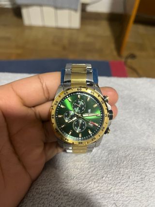 Vendo reloj Festina Chronograph con diseño bicolor (acero inoxidable con detalles dorados) y esfera verde oscuro. Muy poco uso, funciona perfectamente. • Cronógrafo funcional • Indicador de fecha • Pulsera de acero inoxidable bicolor • Movimiento de cuarzo • Incluye caja original