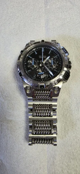 Elegante reloj Festina con múltiples funciones y un diseño moderno. - Esfera negra con detalles plateados. - Correa de eslabones plateada. - Bisel con marcadores de tiempo.