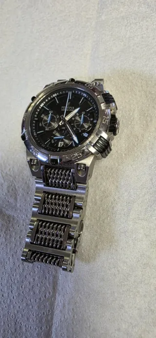 Elegante reloj Festina con diseño deportivo y esfera negra. - Caja y brazalete de acero inoxidable. - Cronógrafo con múltiples subesferas. - Indicador de fecha. - Bisel giratorio con marcadores.