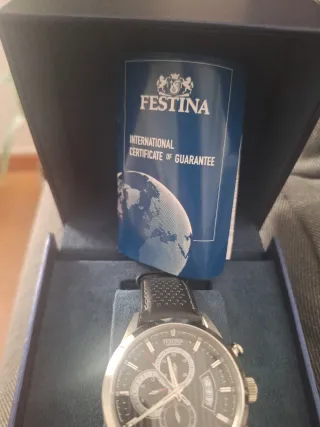Reloj Festina para hombre, en estado excelente. Usado solo en tres ocasiones, prácticamente como nuevo. Esfera negra elegante con detalles dorados. Indicador de fecha. Caja en acero inoxidable. Correa de piel auténtica en perfecto estado. Funciona perfectamente.