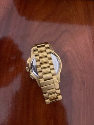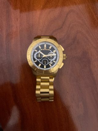 Reloj cronografo dorado y negro en acero. Tal como está. No funciona. Lo ha dado todo Para repuestos. Tiene algunos numerales de la fecha algo oxidados por lo que presupone que le entró agua. Obviamente no se acepta devolucion.
