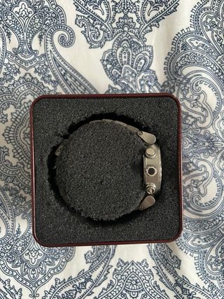 Número de serie 250709.Pila nueva recién puesta. Perfecto estado. Alguna ligera marca en la tapa trasera por el cambio de pila (ver fotos). Acero inoxidable con piel en la correa. Sin caja ni instrucciones. Las instrucciones se pueden descargar en la web. Sumergible 100 metros.