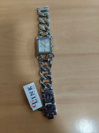 Reloj de pulsera con cadena semirrígida. - Esfera cuadrada con números romanos. - Diseño elegante y moderno. - Falta remplazar la pila. - - Se adjuntan dos piezas por si se tuviera que agrandar. - Pocas veces puesto.
