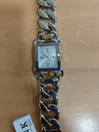 Elegante reloj de pulsera para mujer de la marca Guess. - Diseño con eslabones grandes. - Esfera cuadrada. - Acabado plateado brillante.