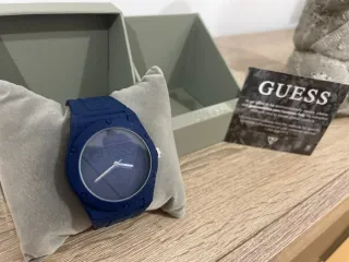 RELOJ GUESS ●Modelo retro pop ●Código W0979L4 ●Precio original 75-90€ ●Descripción Reloj guess con estilo deportivo y minimalista, esfera de 42mm en silicona azul al igual que sus correas, utiliza un mecanismo de cuarzo analogico de alta precisión, cuenta con cristal mineral resistente al agua hasta 30 metros (Carece de pila)
