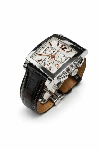 Elegante reloj con correa de cuero negra y detalles plateados en la esfera. - Diseño moderno con múltiples subesferas. - Bisel metálico. - Correa de cuero. - Cierre de hebilla.
