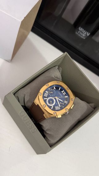 Elegante reloj Guess con un diseño moderno y llamativo. - Esfera de color azul profundo. - Caja y detalles en tono dorado. - Correa de cuero marrón.