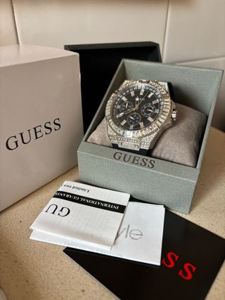 Vendo reloj Guess Kingdom GW0565G1 para hombre, original, comprado en joyería hace menos de 2 años (precio nuevo entre 200 € – 300 €).  ➤ Caja y correa de acero dorado con cristales. ➤ Esfera negra con logo Guess y diseño elegante. ➤ Funciona perfectamente, pila nueva / revisada. ➤ Le faltan algunas perlitas en el bisel, tal como se ve en las fotos (esto se refleja en el precio). ➤ Ideal regalo de Reyes o como reloj elegante para diario. 💰 (Negociable / acepto ofertas razonables) 📍 Entrega en mano en Chiclana / Cádiz o envío con seguimiento.
